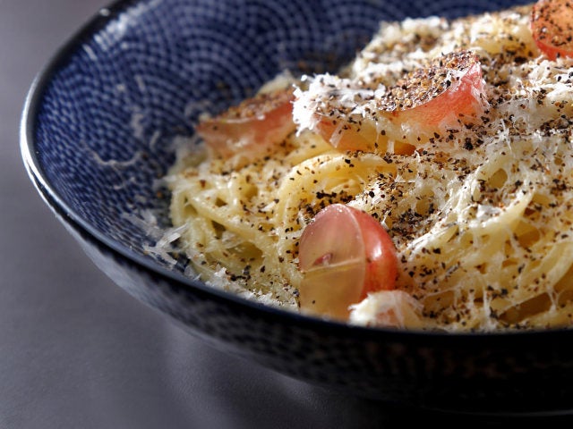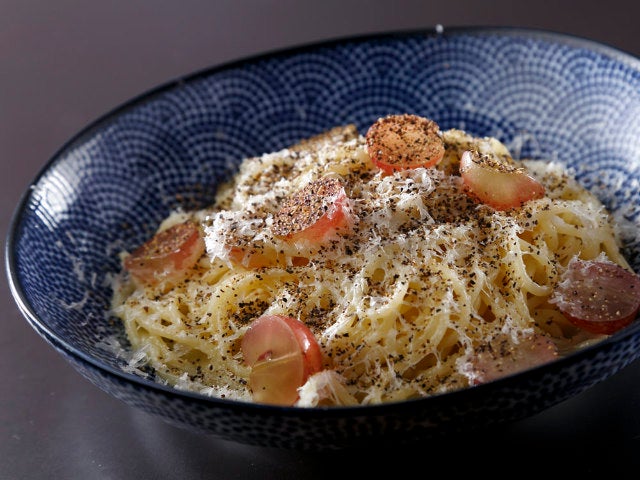ブドウとの組み合わせを意外に思うかもしれないが、相性が実にぴったり。ブドウの甘酸っぱさがバターとチーズのシンプルなパスタをパッと華やかにし、味わいを爽やかにしてくれる。定番パスタもフルーツを使うことで、新しい顔を見せてくれるのが驚きだ。
