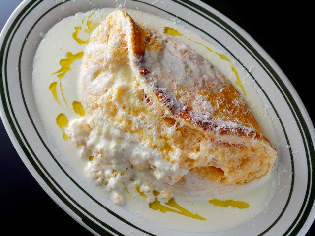 フワフワのオムレツは、スプーンを入れた途端に卵がとろんと流れ、チーズがたっぷり入ったクリームソースと一体化していく。口の中に入れると泡雪のように溶け、コクのあるペコリーノロマーノ(塩味の強いハードタイプチーズ)が後から追いかけてくる。食べた感覚がないほど一口があっという間になくなるので、二口三口とスプーンが止まらない。