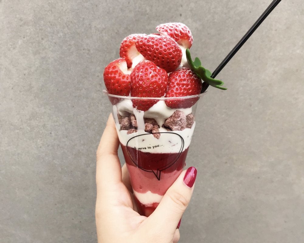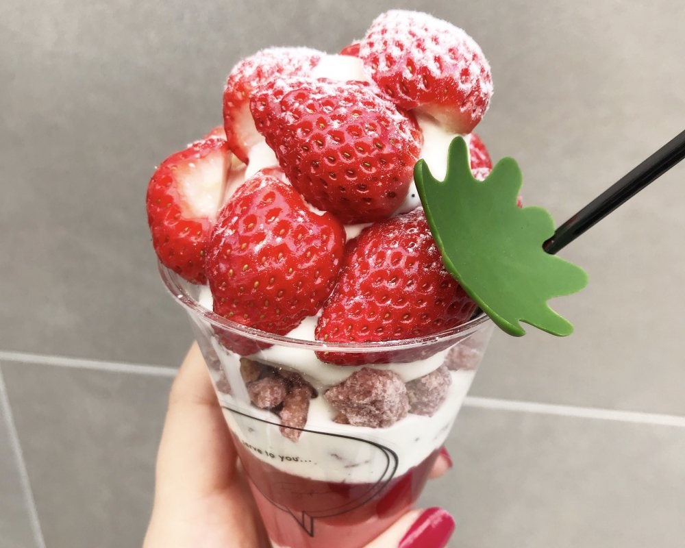 熊本県産ゆうべに苺を6個も使用した贅沢なパフェは、苺ファンならずとも、ぜひ食べたい一品!コーン型の透明なカップに入っているので、きれいな断面を拝むことができます。ちなみに苺のヘタはチョコレートでできているので、余すことなくおいしく食べることができますよ♪