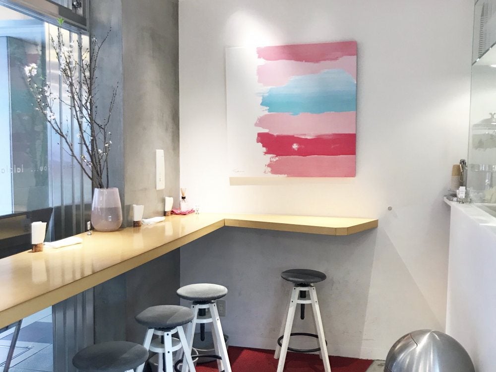 白を基調としたイートインスペース。壁に飾られた、ショップカードにもなっているカラフルな絵の前で写真を撮る、インスタ女子が多数!
