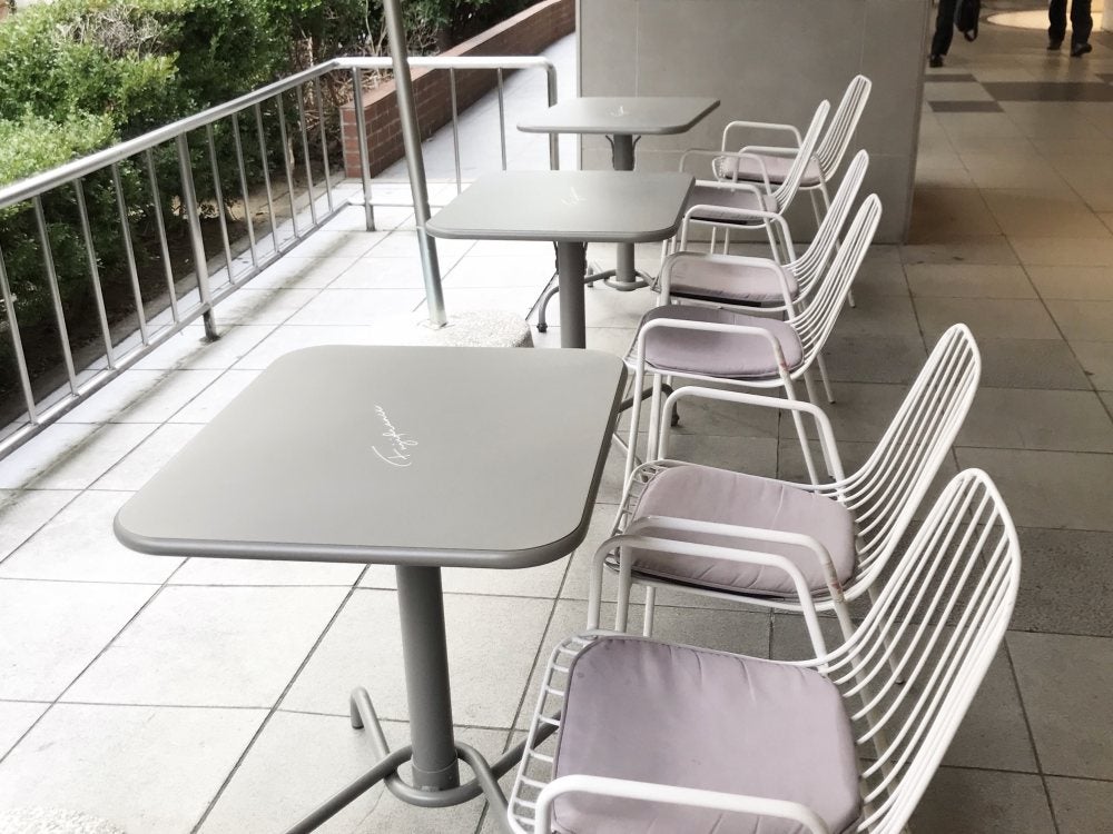 お店の外にはこんなイートスペースもあります。お店の名前が書かれたテーブルで、ケーキの写真を撮るのがお決まりなんです。