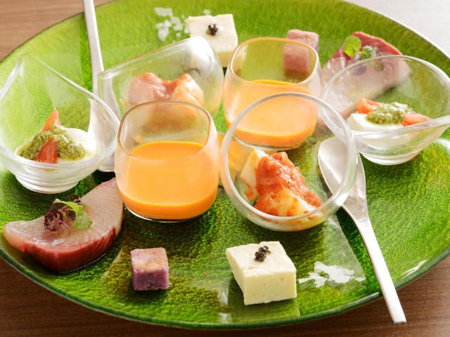 その日によってメニューは異なるが、この日艶やかな緑色の器に盛られていた6種類は、マイルドな口当たりの「赤ピーマンのムース」、酸味とコクが絶妙な「フルーツトマトとモッツァレラのカプレーゼ」、淡雪の塩をちょこんとつけていただく「湯葉豆腐とキャビア」、塩味が食事のスターターとしてぴったりな「紅芋のフィナンシェ」、脂ののった「新潟県佐渡産ブリのカルパッチョ」、ムチムチとした食感がたまらない「イタリアン風イカめし」。