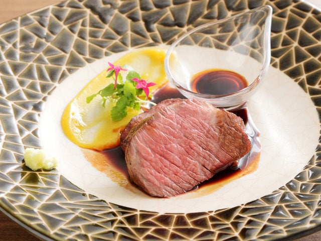 すりおろされたばかりの香り高いワサビやスモーク醤油、ルビーポートワインとマデラワインの2種を使用した甘みのあるソースを好みで合わせていただこう。