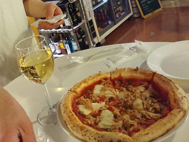 この日は、洋酒場が集まるエリアに移動し、〆にピッツア(写真上)。タマネギとツナとトマトソースというシンプルなものをオーダー。店内の窯で焼いてくれるのがうれしい。これにあわせるのはイタリアの白ワイン。