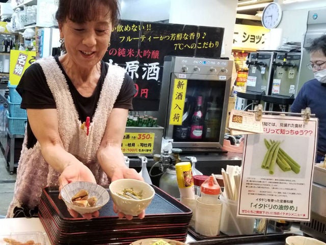 胃袋が少し落ち着いたら、高知ならではのカツオの塩辛「酒盗」ときんぴらともメンマともいえるような不思議なテイストがなんとも楽しい山菜の「虎杖(いたどり)」(写真上)。これで酒が止まらなくなること必至。