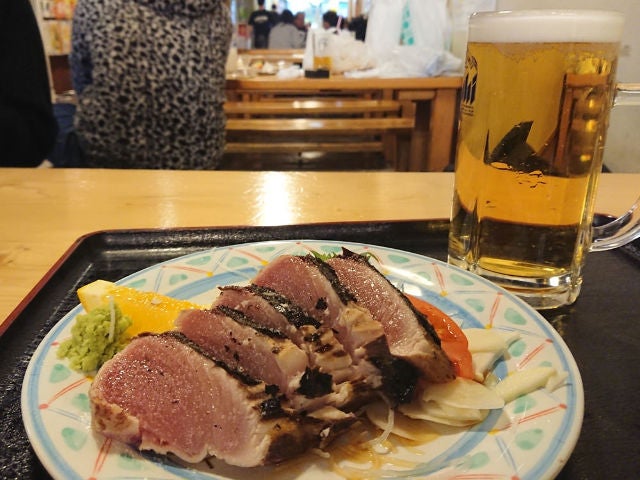 では、筆者と一緒に迷い込んでいただこう。最初はなんといっても「カツオのたたき」(写真上)から。カツオのたたきは高知でも人気の『明神丸』をはじめ、多くの店で扱っている。