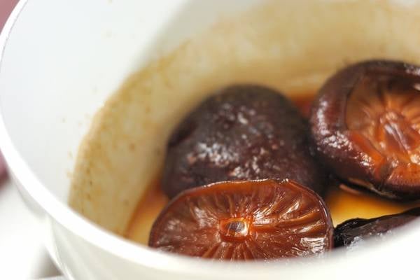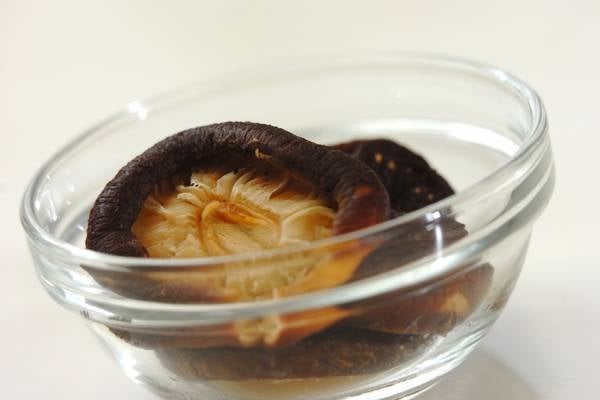 ・シイタケは一晩つけて柔らかく戻し、軽く絞って軸を切り落とす。戻し汁は網を通しておく。