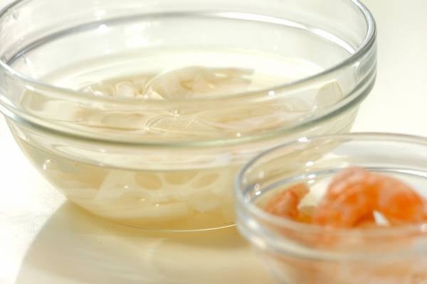 ・むきエビは背ワタを取る。レンコンは皮をむき、縦半分に切って薄切りにし、酢水に放つ。