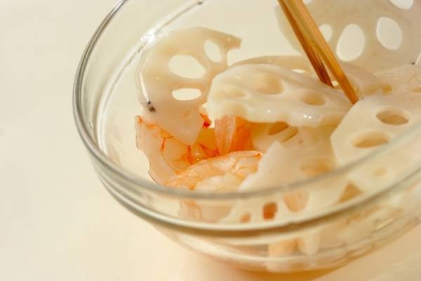 4、(3)でゆでたむきエビとレンコンを作り置き甘酢にからめる。レンコンの半量を粗くみじん切りにする。