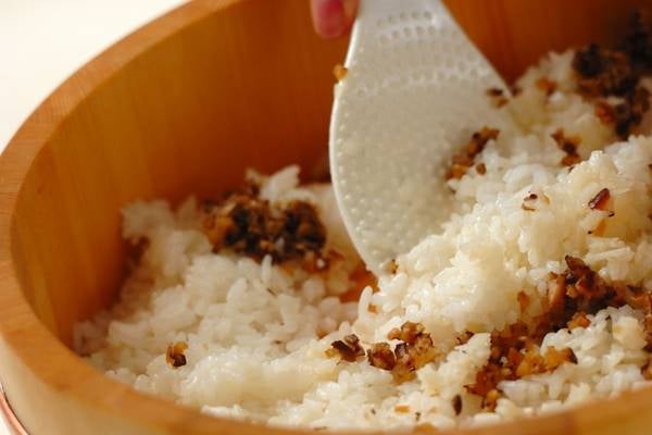 5、ご飯を飯台にあけ、作り置き甘酢をかけ、しゃもじで混ぜ合わせてウチワであおぎ手早く冷ます。みじん切りにしたシイタケとレンコンを加え、混ぜ合わせる。