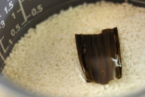 ・お米は洗ってザルに上げ、30分置く。1.5合分の水より少し少なめに水加減し、昆布をのせてスイッチを入れる。