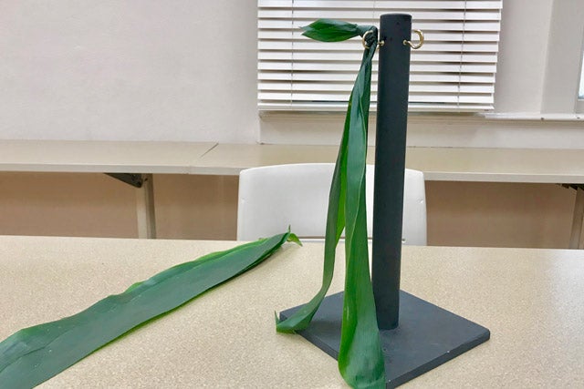 多くのフラダンサーはレイの先を足の指で引っ張りながら編んでいきますが、Mihoさんは初めてでも扱いやすいようにフックを使って編む方法を教えてくれました。