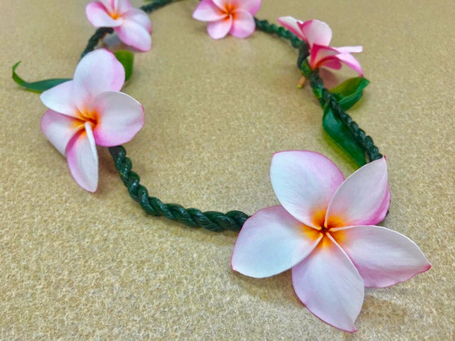 私が編んでいる間にMihoさんが外から採ってきてくれたプルメリアを間に挿して完成。女の子らしい可愛いレイが出来上がりました。