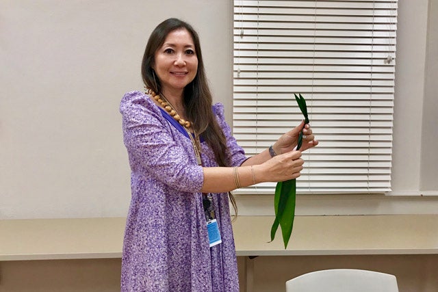 フラレッスンに現れたのはミイラニ先生!以前このコラムでもご紹介した『アロハフロウ(http://www.hawaiist.net/column/31365)』の先生です。ミイラニ先生が今はビショップミュージアムのフラレッスンをご担当しているそうです。もちろん同じくフラダンサーのご主人もご一緒で、イプを担当してくれます。