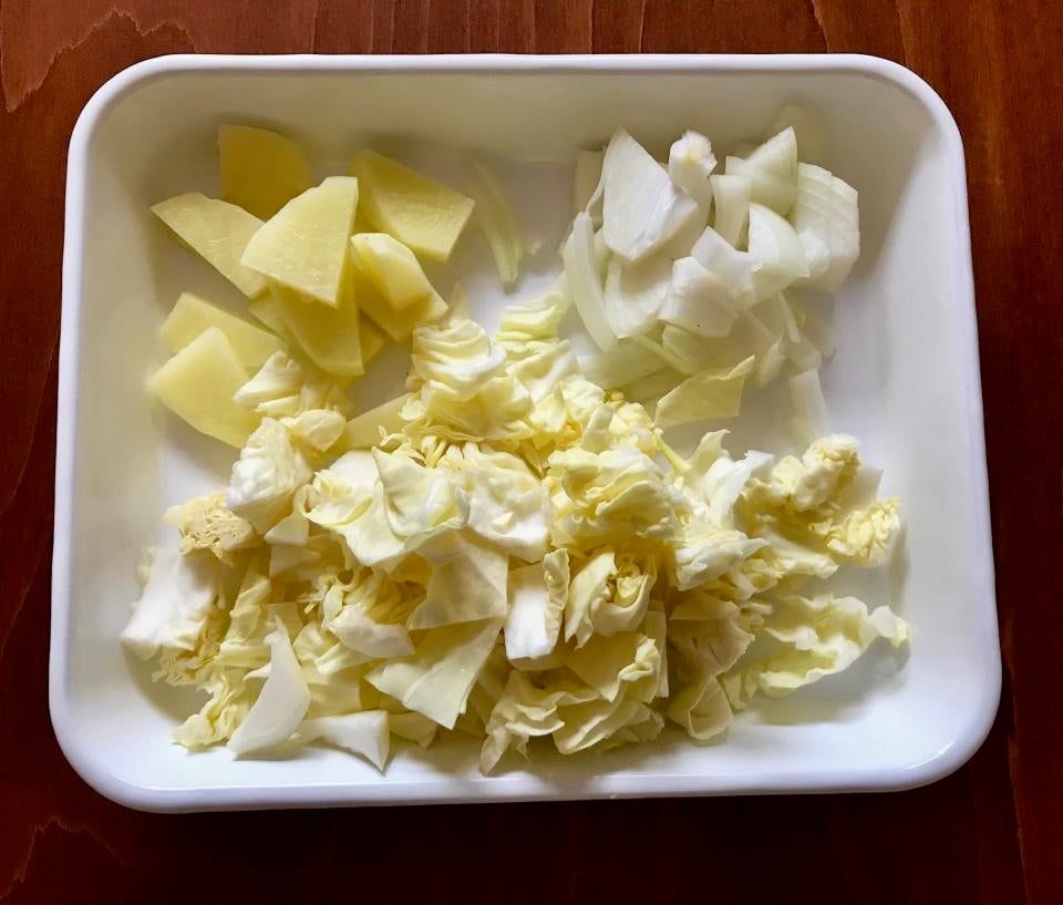 1.キャベツ、じゃがいも、玉ねぎをざく切りにする