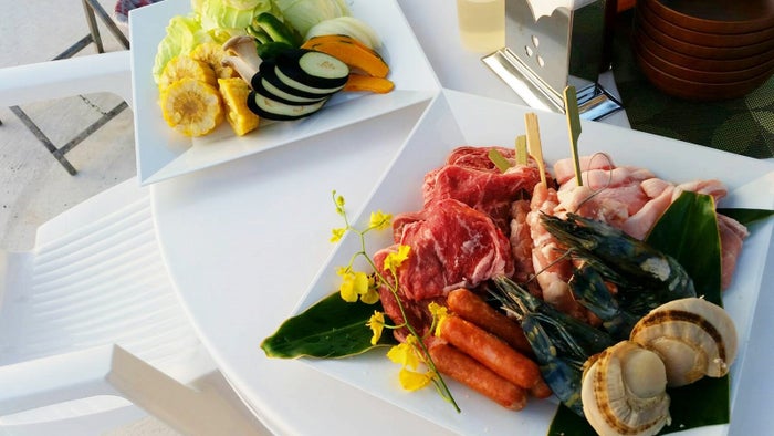 メニューは、あぐー豚のあぶり焼き、今帰仁ソーセージ、ゆし豆腐などのアラカルトから、あぐー豚の鉄板焼きセットまで、沖縄料理を中心とした内容。さらに予算からコースを選べるバーベキューもあり、予約しておけば具材も機材もすべてお店側で用意してもらえます。