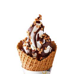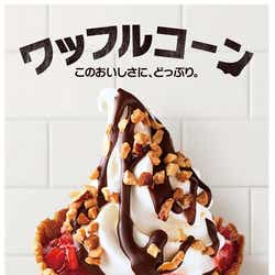 【マクドナルド/ビューティーガール】マクドナルドは、ワッフルコーンシリーズのトッピング3種を“全部のせ”した新作「ワッフルコーン 全部のせ」を、2019年5月29日(水)より、全国のマクドナルド店舗にて期間限定で販売する。 ワッフルコーン登場1周年を記念した新作は、ミルクリッチなソフトクリームにチョコソース、アーモンド、ストロベリーソースを贅沢にトッピングし、サクサクした食感の香ばしいワッフルコーンと一緒に楽しめる一品。