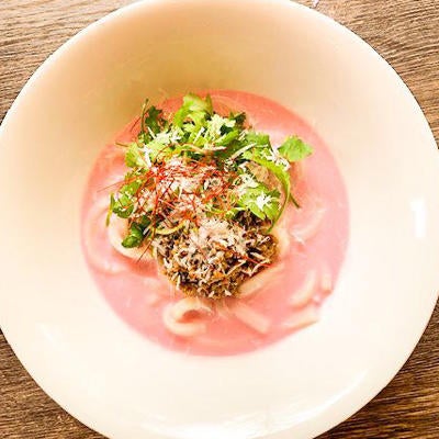 ▲湘南豚の冷し桃色カレーうどん 930円(カレー単品 800円)/淡い桃色の冷たいスープに、湘南豚の挽肉とパクチーとたっぷりのチーズをトッピングしたカレーうどん。