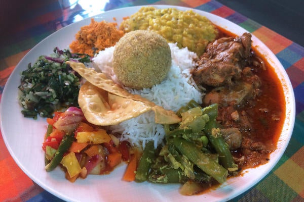 ▲スリランカスタイル ワンプレートカレー 1,300円(カレー単品 400円~)/4種類のおかずとサバのコロッケにチキンカレーとダールカレー、バスマティライスが付いたワンプレートセット。