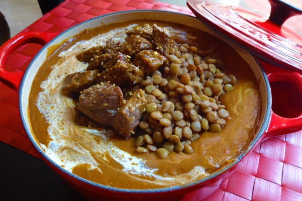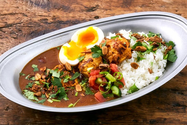 ▲ビーフ&ダールマサラカリー 600円(※カレー単品価格)/数種のスパイスとフレッシュなトマトを使用した英国生まれのインドマサラカレー。放牧牛グリルと煮込んだレンズ豆がポイント。