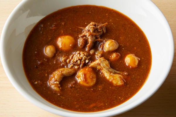 ▲比内地鶏もつとお豆の薬膳カレー 600円(※カレー単品価格)/10種類以上のスパイスとコラーゲンをじっくり煮込み、塩麹で漬け込んだ比内地鶏もつを加えた薬膳カレー。