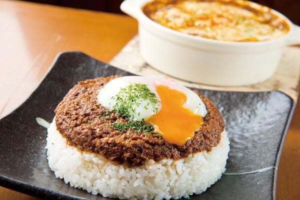 ▲温玉のせキーマカレー 500円(※カレー単品価格)/水を一切使わず仕上げた素材の旨味がぎゅっと詰まったカレー。 油の使用も最小限でとてもヘルシー。