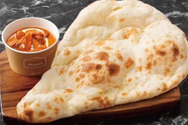 ▲バターチキンカレー&ナンセット(甘口) 700円(カレー単品 500円)/トマトとバターで仕上げた濃厚でマイルドなチキンカレーは焼き立てナンとの相性抜群!