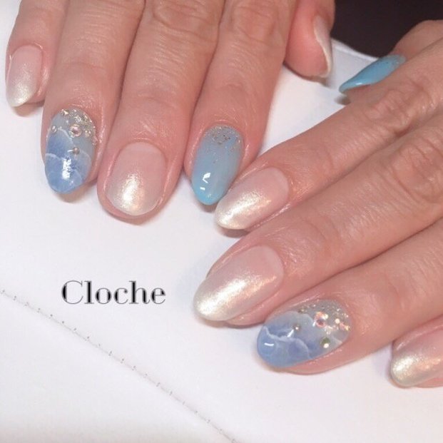 偏光パールや細やかなラメネイルを合わせることで、エレガントな波ネイルに仕上がります。淡いブルーの波ネイルに合わせれば、フェミニンなムードもアップしますね。