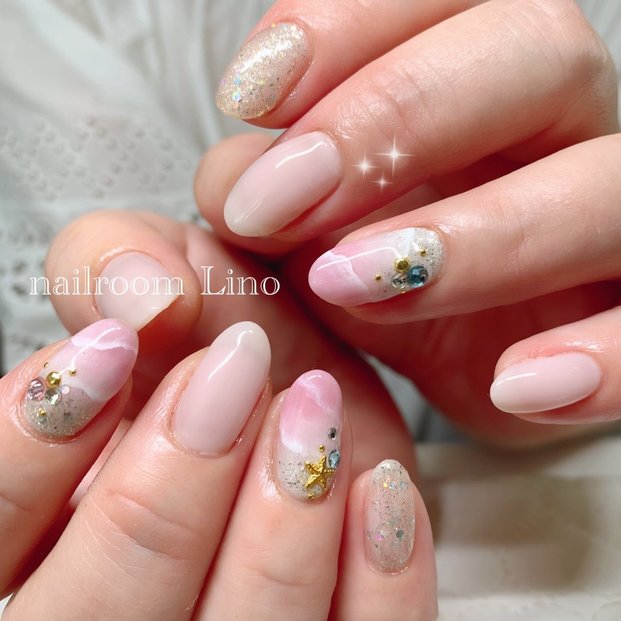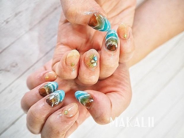 砂ネイルデザインをかけ合わせることで、波らしいムードもアップします。ターコイズやコンチョパーツを取り入れれば、カジュアルな印象の波ネイルに。