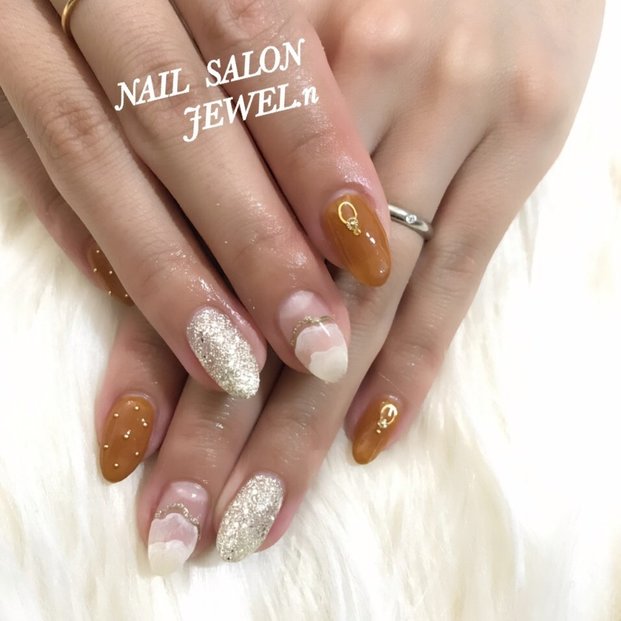 ブラウンカラーを合わせれば、スタイリッシュな印象が加わります。ラメやゴールドパーツを合わせることで、ヘルシーながらもリッチなムードの指先にまとめるのもおすすめですよ。