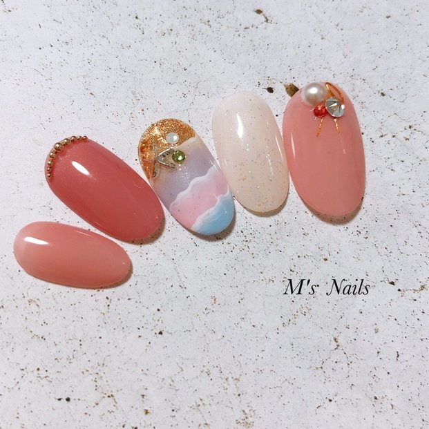 カラフルなカラーの波ネイルは、ペールトーンでまとめることで上品に楽しむことができます。ピンクコーラルを合わせれば、フレッシュな印象の夏ネイルが楽しめるのでおすすめです。