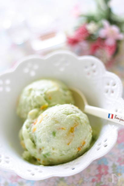 先ほどのなめらかフローズンヨーグルトに抹茶を混ぜると、大人が喜ぶほろ苦いデザートに変身します。茹で小豆と一緒に盛りつけて、甘さと苦さを同時に味わってはいかがでしょう?