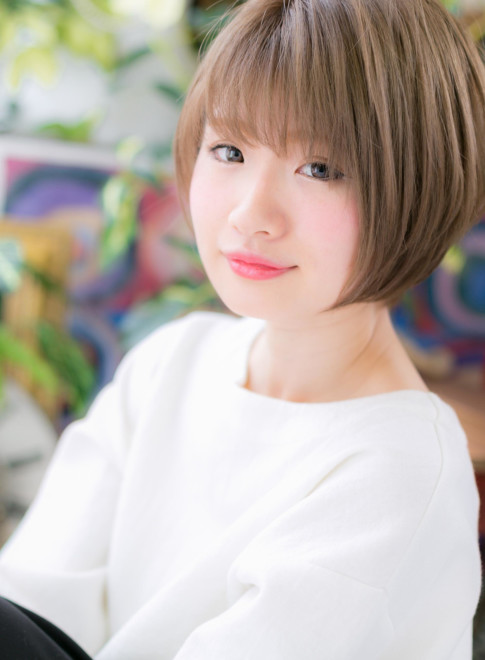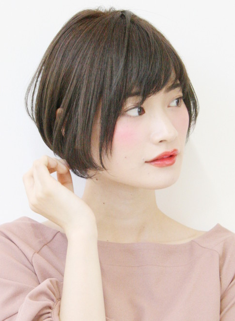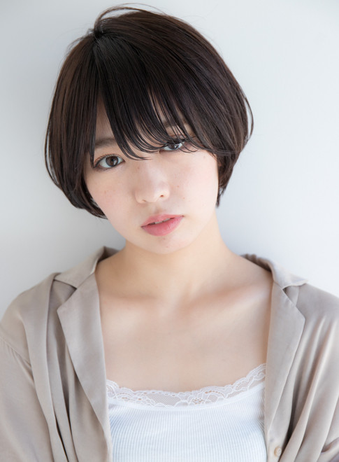 ぱつんとしたカットラインが特徴の前下がりショートです。ラインは残しつつ程よく透け感を作って軽やかに。カラーはダークアッシュブラウンでクールな雰囲気を作っています。