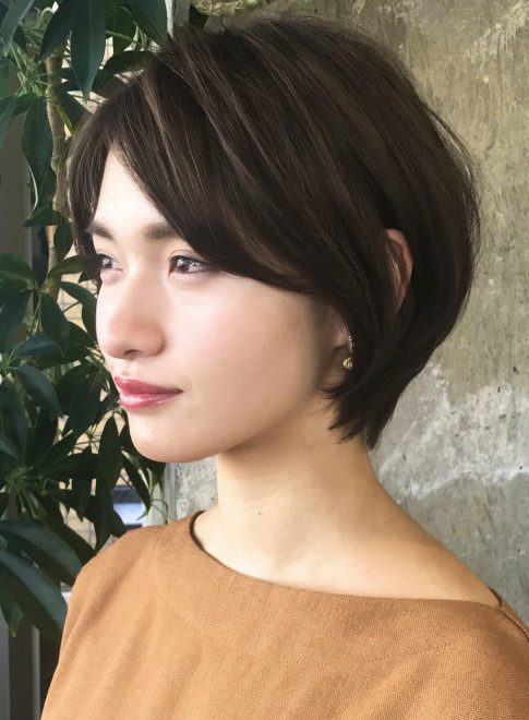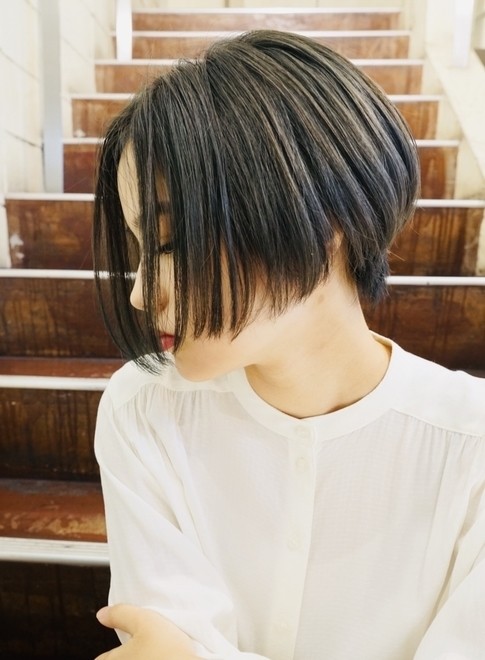 ナチュラルな印象の前下がりショートです。前髪は目の下でカットして透け感を作っています。カラーは黒髪もしくはダーク系が一押しです。
