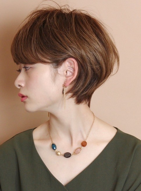 大人の女性として上品さも意識したい人にも、ショートボブがお似合いです。こちらはひし形シルエットで、どの角度からも小顔に見えるスタイル。軽やかさを持たせて、スレンダーな印象に。ツヤ感のある仕上がりと美シルエットで品のある雰囲気のできあがり。