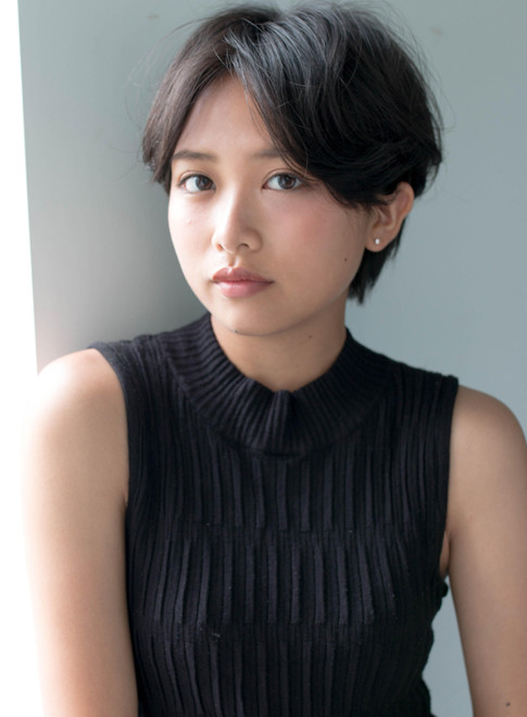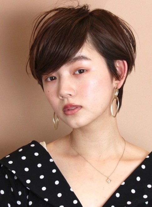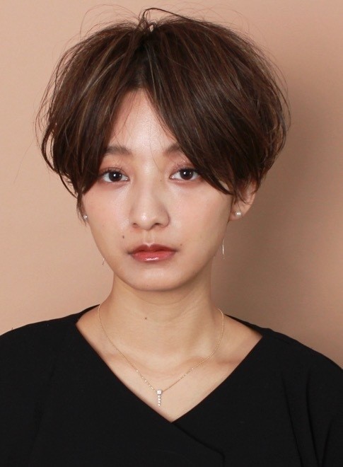 黒髪だけど軽やかなエアリー質感のショートです。ベースは丸みのあるフォルムにカットし、適度に透け感を作っています。ショート初心者さんでもトライしやすいスタイルです。