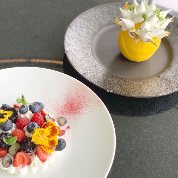 見た目も華やかな料理がずらり!ディルクリームとスモークサーモンにキャビア添えピザにはじまり、トウモロコシの甘さが際立つラピオリ風パスタにたくさんの黒トリュフスライス、磯の香りが新鮮なシーフードタワーなど、風味も豊かな1品に仕立てたものが揃います。