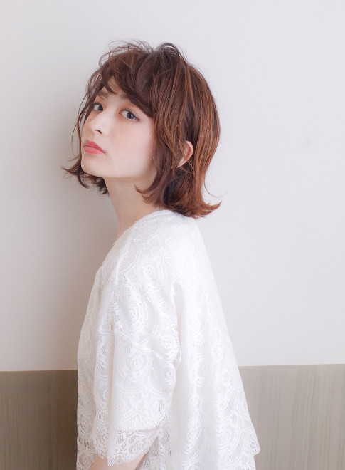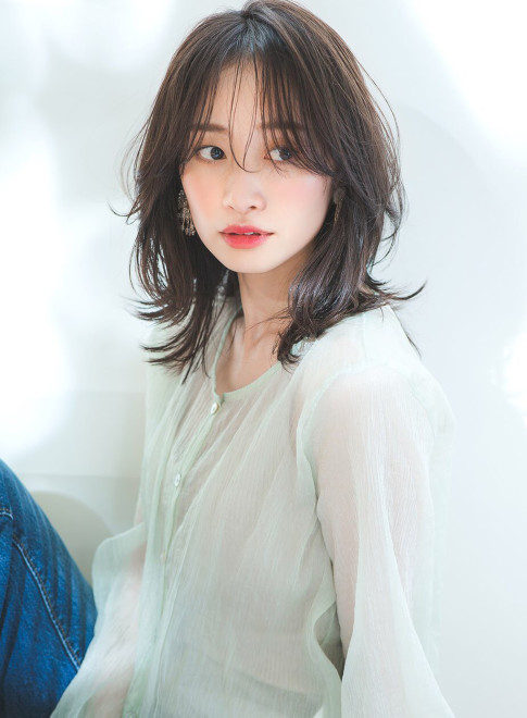 ストレート×内巻きのふんわりミディアムは、愛らしくかわいい髪型です。片耳だけかけると、フェイスラインから首にかけてストレートなラインが引き立ちます。女性らしくも大人っぽい表情にプチイメチェン。