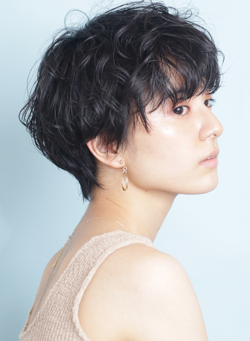 クセを生かして作るカーリーなショートヘアは大人の女性らしさを表現するのにピッタリ。首回りをスッキリさせ、ひし形シルエットで作るシルエットは小顔効果も絶大です。