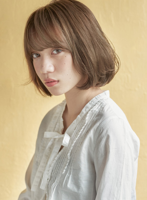 ブリーチをしてからカーキアッシュを入れると、髪色がきれいに映えます。ハイトーンでも派手すぎず、落ち着いて見えるのも魅力。ベージュもプラスして、より柔らかい色味に。秋らしく女性らしい、魅力的なボブスタイルの完成です。