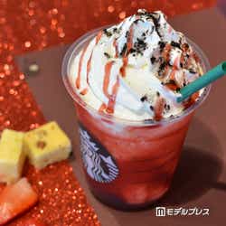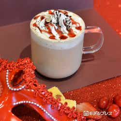 まずは「ハロウィン レッド ナイト フラぺーノ」をご紹介。まるでフラペチーノが仮面をつけたような真紅のレッドベリーソースが全面を覆う、鮮やかなビジュアルが印象的です。まるごと一個のホワイトチョコレートのブラウニーがブレンドされているそうで、ホイップクリームにはレッドベリーソースに加え、真っ黒なココアパウダーがトッピングされています。実際に飲んでみると、ふわっと優しい甘さが広がり、見た目からの印象よりもベリーソースは酸っぱすぎず、程よい甘酸っぱさのある味わい。酸味があるので、甘すぎるのが苦手な男性にも飲みやすいフラペチーノになっています。