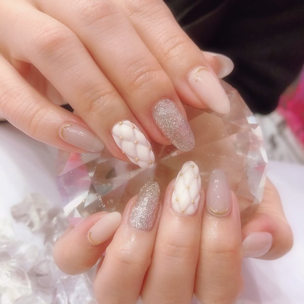 もこもことした立体的なキルティングネイルで、エレガントでかわいらしい印象の手元に。ゴールドラメを合わせれば、スペシャルなムードがアップします。