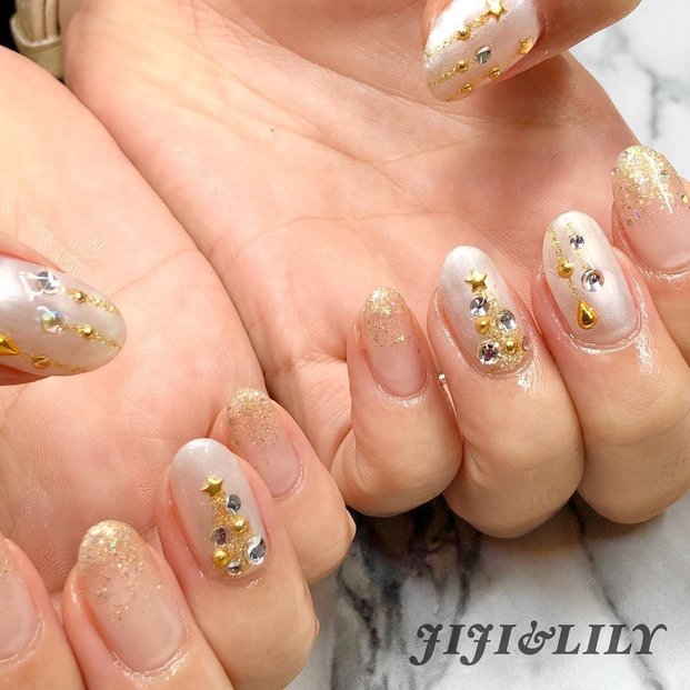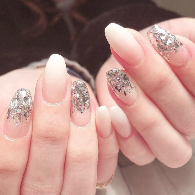 同じホワイトネイルも、シアーなカラーならヌーディーな手元を演出できます。きらきらとしたビジューやラメを合わせれば、きらめきを生かしたスペシャルなネイルにまとまりますよ。