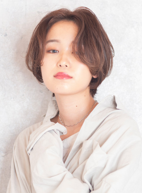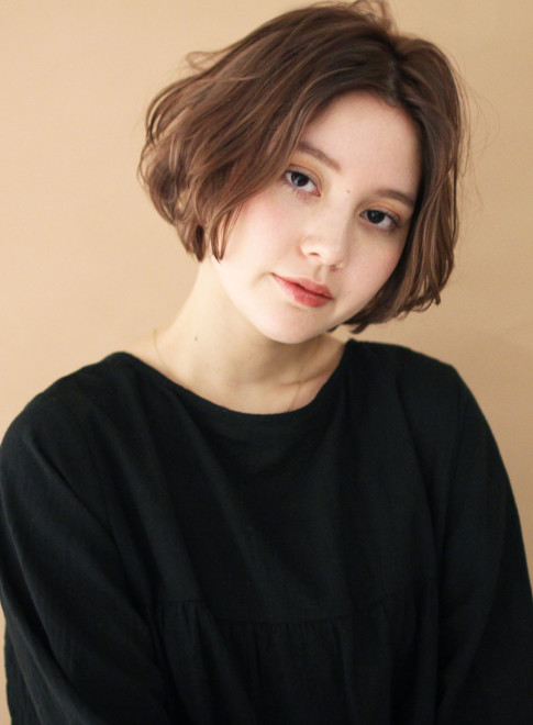 丸みのあるフォルムに仕上げた、大人可愛い雰囲気のショートボブです。前髪は自然に斜めに流して、ニュアンスと目力アップ効果をプラス。重ためにカットしているので、乾かすだけでまとまります。
