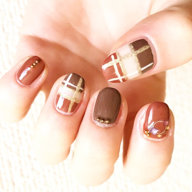 トレンド感を取り入れたいときにおすすめなのが、今季大人気のブラウンを基調としたチェックネイルです。フリーハンドで描いたチェック柄はぬくもりがあり、赤みのあるブラウンに合わせると可愛らしく見えますよ。