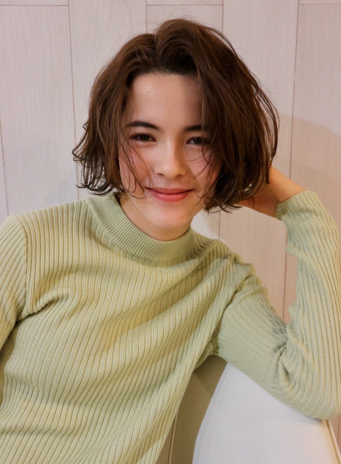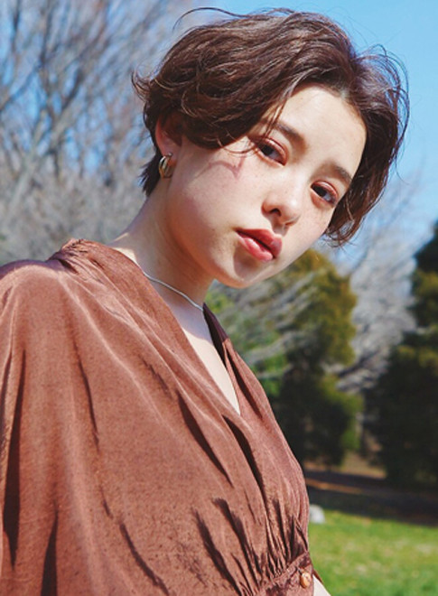 人気のマッシュショートに、毛先のパーマでラフ感をプラス。オン眉の前髪でも、パーマの動きがあることで幼く見えるのを回避できます。