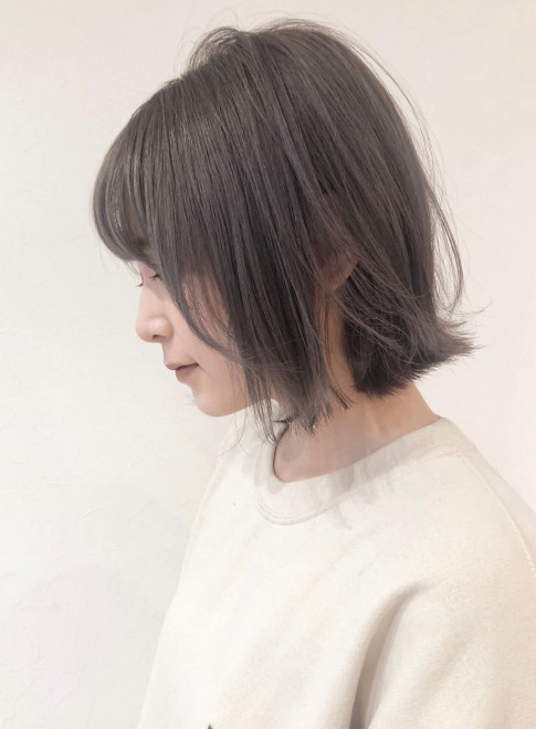 うっすらラベンダーのグレージュは春めく髪色。切りっぱなしボブの強めな雰囲気をフォギーカラーで和らげてくれます。春ならではの髪色×髪型で旬顔GETです。