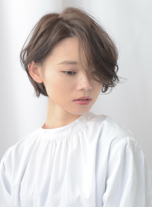 ツヤ感がありながらも大人っぽい髪色のフォギーベージュ。空気感をたっぷりまとわせた丸みショートはマニッシュな雰囲気。フォギーベージュのエレガントなヘアカラーで、女性らしさも引き出せます。