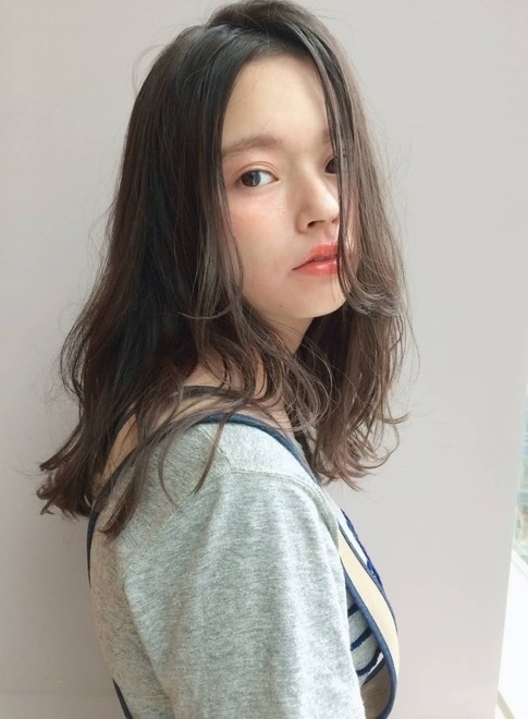 毛先に重さを残した、ゆるふわ質感のミディアムロング。ふわっと柔らかいニュアンスはパーマで再現しています。カラーはベージュ系で透明感たっぷりの髪色に。