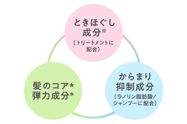 ドライヤーやアイロンの熱で髪内部をときほぐす「ときほぐし成分※」を配合。また、「髪のコア★弾力成分*」と「からまり抑制成分(ラノリン脂肪酸)」でやわらかい髪を洗浄しながら弾力を与え、からまりにくく、まとまりのあるエアリーな仕上がりに。